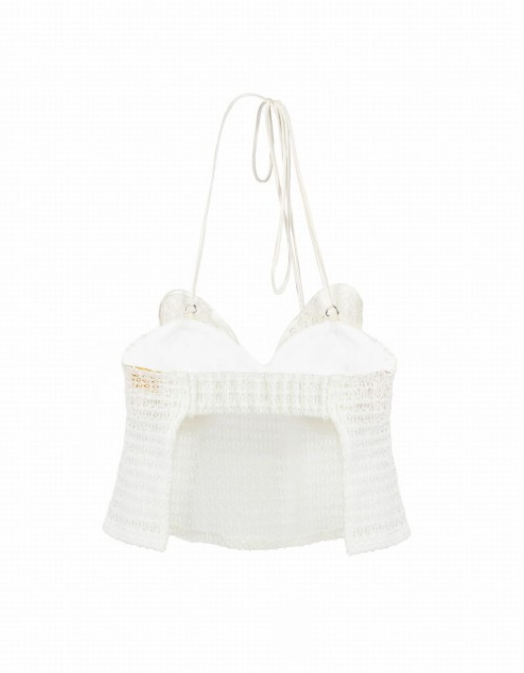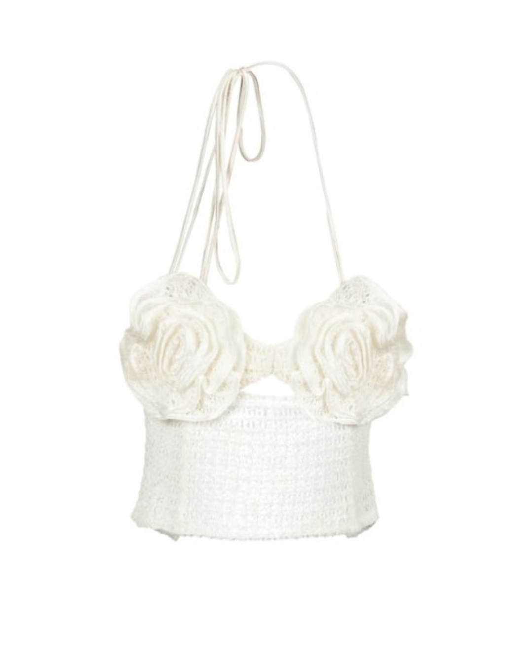 The halter-style top, tied at the neck with satin ribbons, delicately exposes the shoulders while a soft elastic band at the back ensures a perfect fit. Crafted from intricate crochet lace, the top is adorned with two beautifully sewn roses at the bust, offering feminine charm without the need for padding.