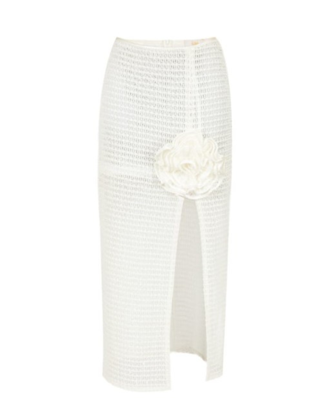 The matching skirt, made from the same delicate fabric, falls gracefully to mid-calf. A front slit, topped with a decorative rose, adds lightness and allure. With a hidden back zipper and subtle lining, it offers both comfort and sophistication.